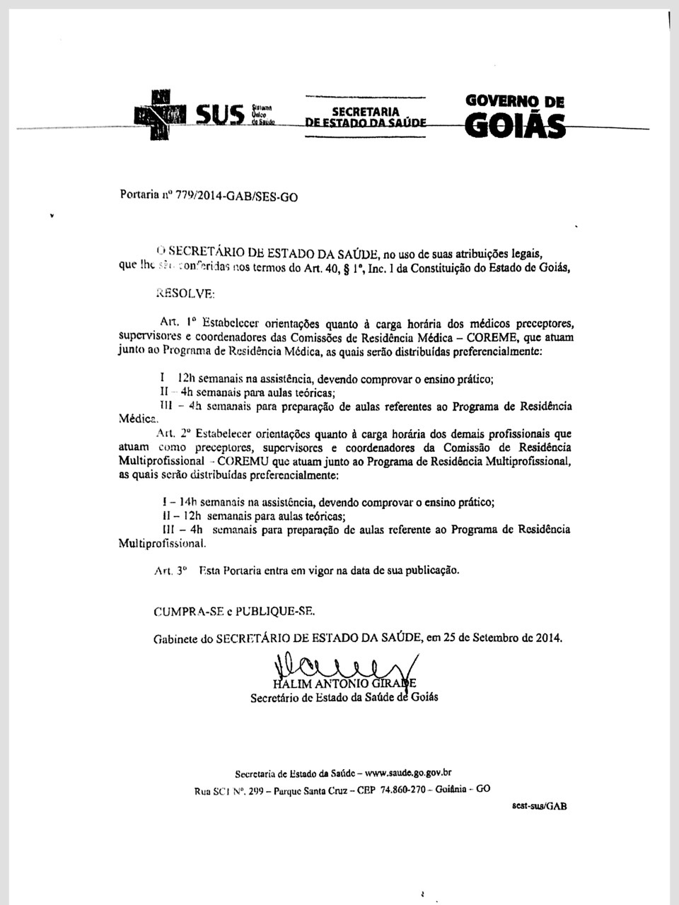 O Conselho Regional de Medicina do Estado de Goiás (Cremego) esclarece que os médicos preceptores de residências médicas no Hospital de Doenças Tropicais Dr. Anuar Auad (HDT) seguem uma escala de trabalho com horários diferenciados e estabelecidos na Portaria número 779/2014 da Secretaria de Saúde do Estado de Goiás e, também estão dispensados do ponto. De acordo com a portaria, a jornada de trabalho prevê 12 horas semanais na assistência (devendo comprovar ensino prático), 4 horas semanais para aulas teóricas e 4 horas semanais para a preparação de aulas para o Programa de Residência.