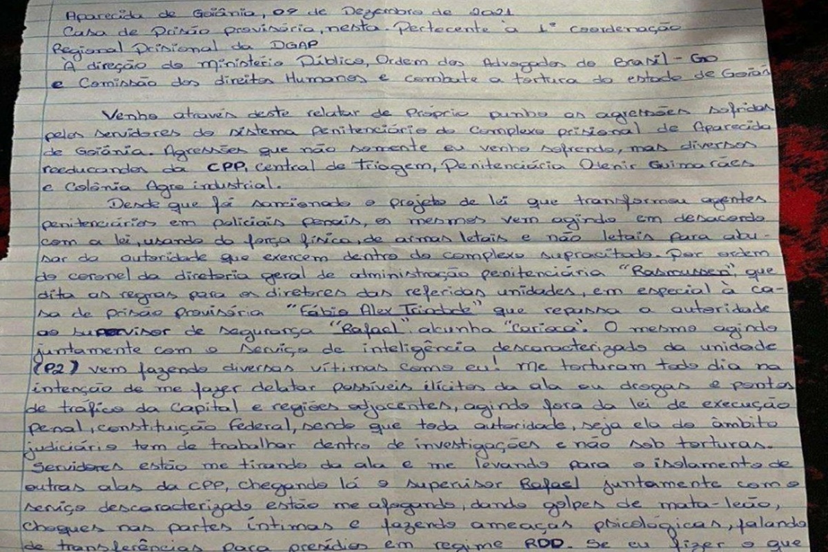 O abaixo-assinado é datado de 9 de dezembro e foi apresentado pela Pastoral Carcerária com denúncias de maus-tratos e torturas no sistema prisional de Goiás. Cerca de 130 reeducandos teriam assinado o documento, mas a perícia concluiu que há indícios de adulteração das grafias em pelo menos 49 nomes, conforme relatado, tendo sido produzidas por um único punho.