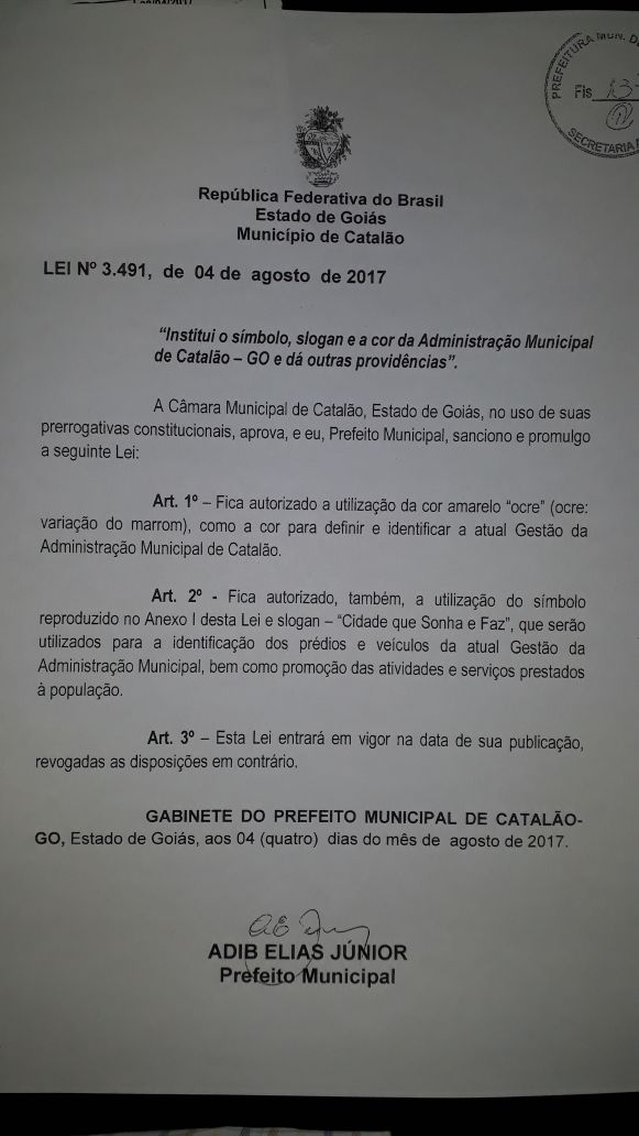 O presidente da Câmara Municipal, que também filiado ao MDB, encaminhou à promotora cópia do Projeto de Lei n° 65, de 18 de julho de 2017, que foi aprovado pela Casa e que tem como o objetivo de educar sobre o símbolo, slogan e a cor atual da prefeitura.