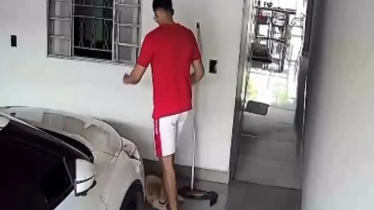 As imagens registradas no dia 3 de janeiro mostram o suspeito agredindo a cadela na garagem da casa