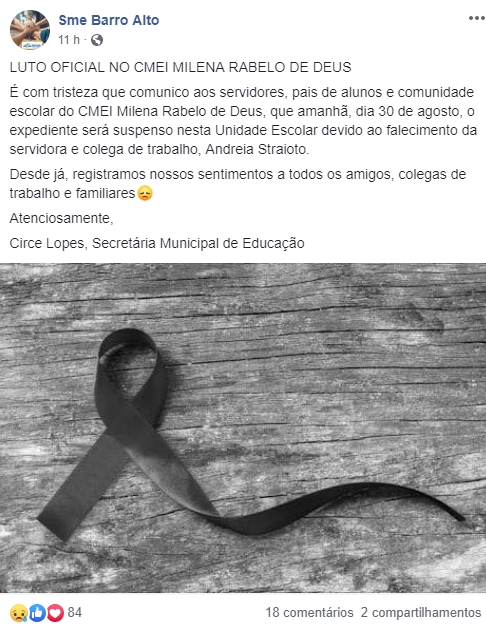 Andreia Straioto era servidora do CMEI Milena Rabelo de Deus, em Barro Alto. Nas redes sociais, a Secretaria Municipal de Educação (SME) lamentou o ocorrido. “Desde já, registramos nossos sentimentos a todos os amigos, colegas de trabalho e familiares”, diz trecho.