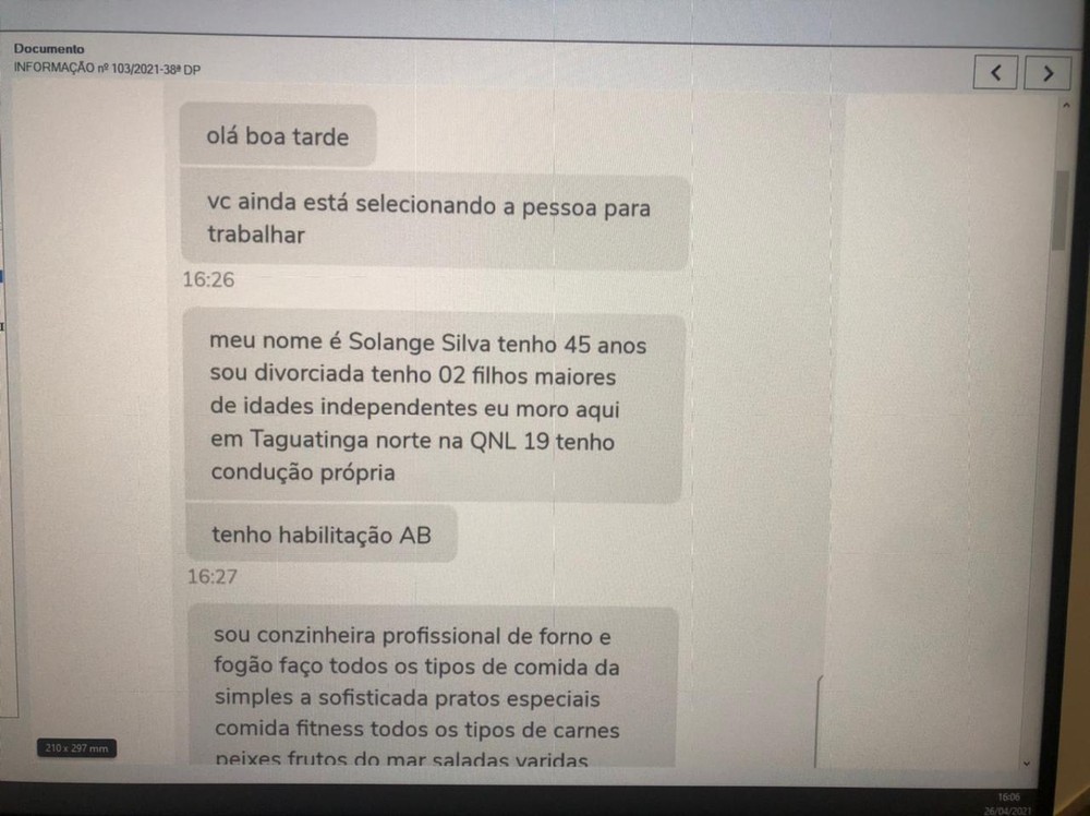 A polícia descobriu que a suspeita utilizava um nome falso – Solange Silva – ara responder os anúncios de vagas de emprego publicados na internet. Em uma das conversas que foram cedidas pela corporação, a suposta funcionária dizia ser cozinheira e que “fazia todos os tipos de refeições para as famílias”.