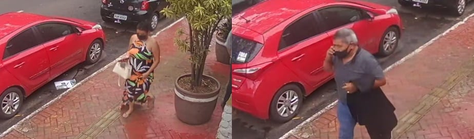 Imagens de segurança do estabelecimento mostram o momento em que a vítima deixa a bolsa em cima da mesa e se desloca para pegar sobremesa a poucos metros. Em uma mesa próxima à da vítima, estão os dois suspeitos. Ao perceber a ausência da administradora, o casal se levanta, pega a bolsa e vai embora.