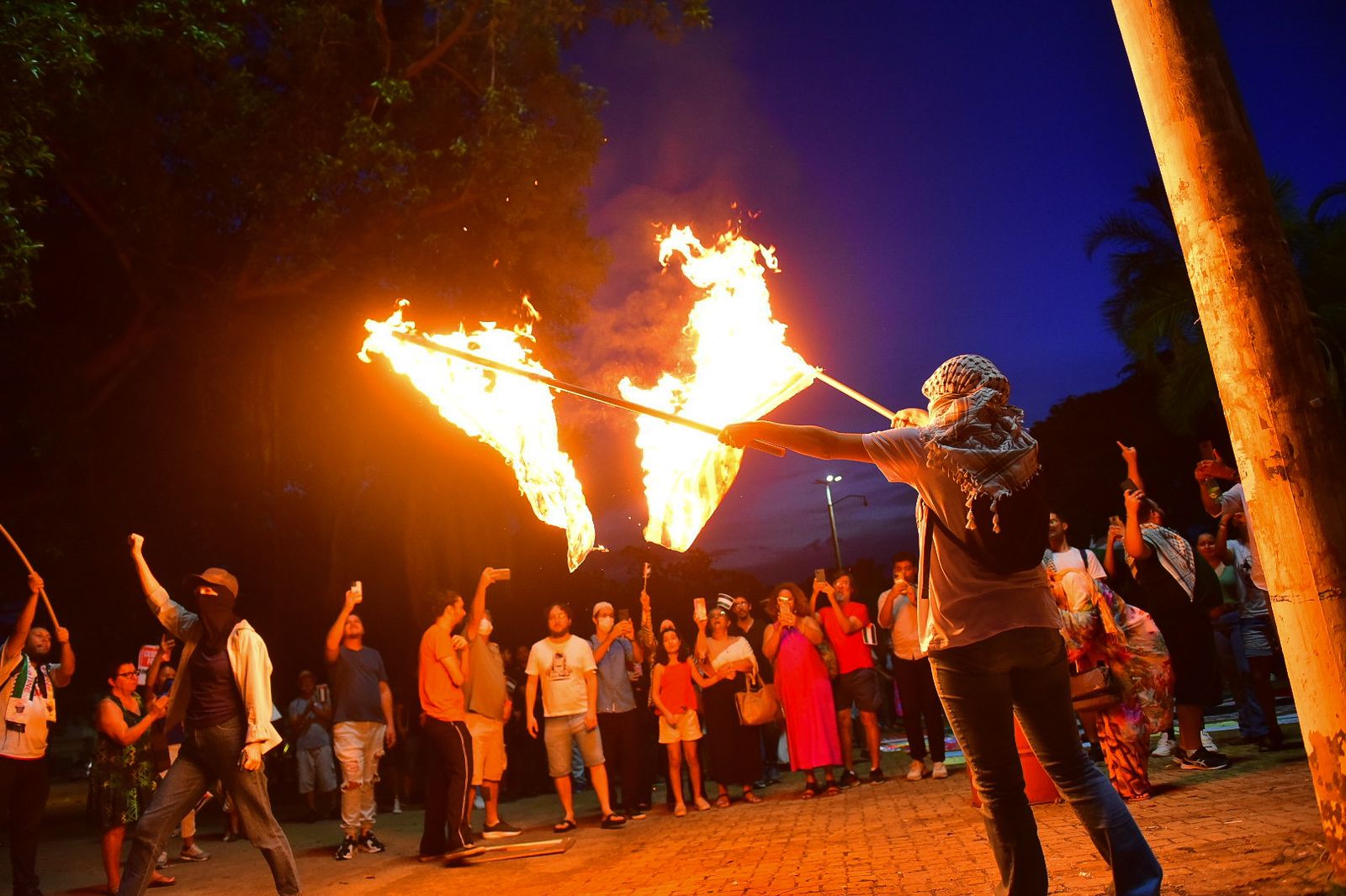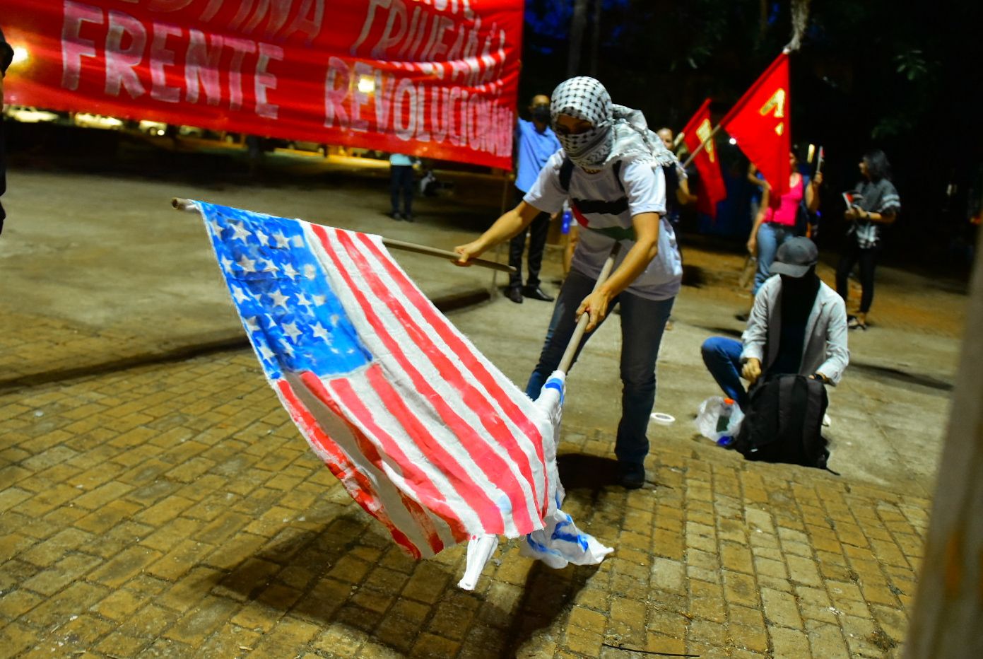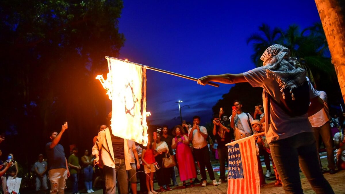 Em um dos pontos altos da manifestação, bandeiras de Israel e dos Estados Unidos foram queimadas num repúdio simbólico