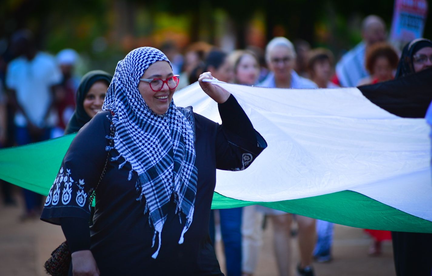 “Precisamos urgentemente de um cessar fogo. Abrir um corredor humanitário para entregar comida e dignidade ao povo palestino. O que acontece lá tem nome e é genocídio. Terrorista é o estado de Israel”, disparava uma manifestante do carro de som. O ato teve três momentos. O primeiro na Praça Universitária, um segundo numa caminhada que culminou no terceiro: a chegada à Praça Cívica.