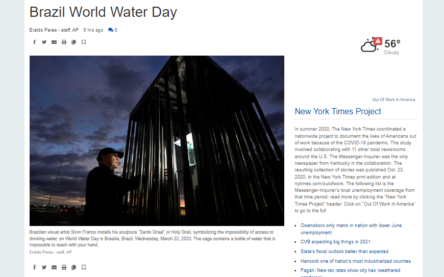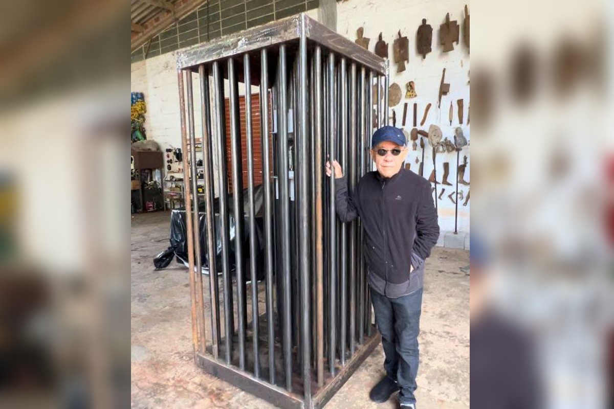 A obra é uma espécie de jaula com uma garrafa de água dentro. O recipiente fica ao centro e bem visível, mas é impossível alcançá-lo. “A intenção é mostrar a inacessibilidade ao que considero o elemento mais importante da vida humana: a água. Você consegue ver, mas não consegue pegar. É angustiante”, explica o artista. Por isso, ele a inaugurou nesta quarta-feira, Dia Mundial da Água.