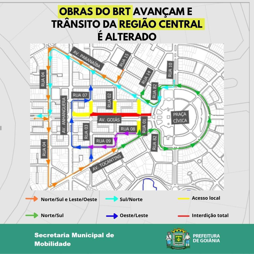 Circulação Norte/Sul – em laranja/verde no mapa: O motorista que segue na Avenida Goiás no sentido Norte/Sul, será desviado para a Rua 4 e Avenida Tocantins, até retomar a circulação da Praça Cívica e acesso à Rua 14.