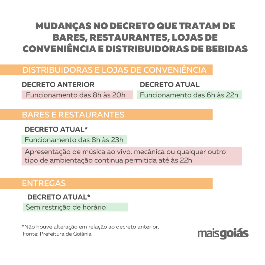 Um novo decreto publicado pela Prefeitura de Goiânia na noite de quinta-feira (4) autoriza a abertura de distribuidoras de bebidas e lojas de conveniência das 6h às 22h. Medida revoga determinação anterior, que permitia funcionamento de tais estabelecimentos entre 8h e 20h. Decisão foi tomada após insatisfação e manifestação da categoria. Novas regras começam a valer a partir desta sexta-feira (5).