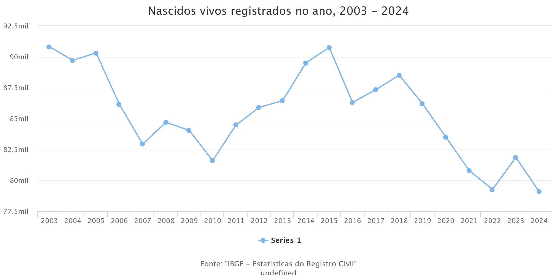 O Brasil teve pouco mais de 2,38 milhões de nascimentos em 2024. Esse número representa uma queda de 5,8% na comparação com os 2,52 milhões de nascidos em 2023, marcando uma sequência de seis anos seguidos com recuo na quantidade de nascimentos.