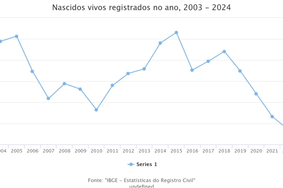 O Brasil teve pouco mais de 2,38 milhões de nascimentos em 2024. Esse número representa uma queda de 5,8% na comparação com os 2,52 milhões de nascidos em 2023, marcando uma sequência de seis anos seguidos com recuo na quantidade de nascimentos.