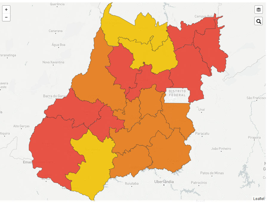 Agora, entre as 18 regiões de Goiás, oito estão em situação de calamidade (risco vermelho); sete em situação crítica (risco laranja) e três em situação de alerta (risco amarelo).