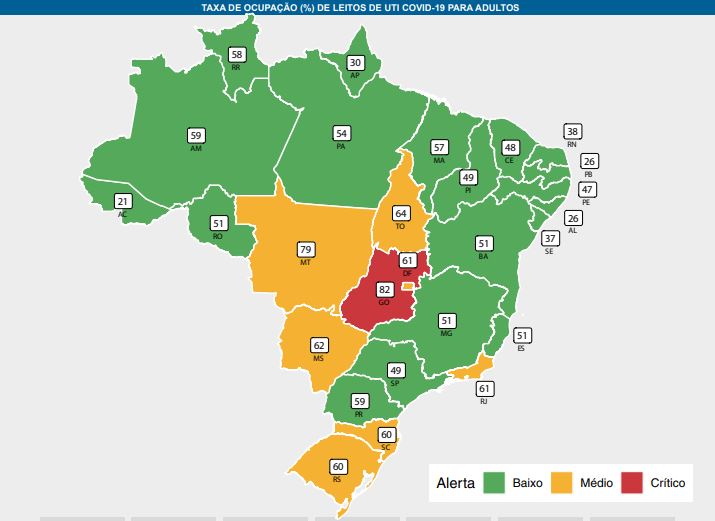 Conforme o mapa da Fiocruz, 19 estados estão com as taxas de ocupação de UTIs para Covid-19 abaixo de 60%, ou seja, fora da zona de perigo; sete (incluindo o DF) estão na zona intermediária, com as taxas abaixo de 80% e somente um, Goiás, aparece na zona crítica, com taxa de ocupação de 82%. O estados na zona verde são Amazonas, Paraná, São Paulo, Minas Gerais, Bahia, Piauí, Maranhão, Roraima, Rondônia, Acre, Ceará, Rio Grande do Norte, Pernambuco, Sergipe, Espírito Santo, Pará, Amapá, Alagoas e Paraíba.