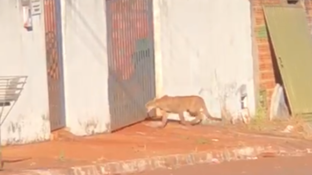 Uma onça foi filmada andando por uma rua de Jataí, na manhã desta sexta-feira (10), e o Corpo de Bombeiros foi acionado para captura do animal. O registro foi feito próximo a uma unidade de saúde e mostra a onça correndo após um cachorro latir no portão.