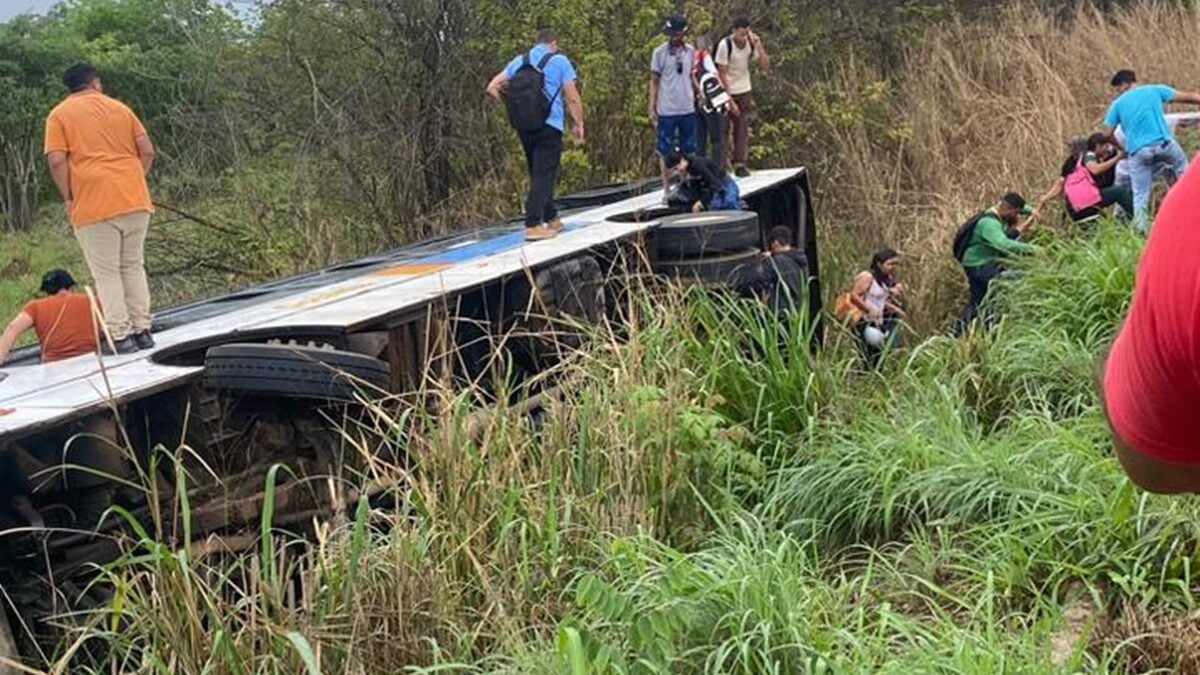 Ônibus escorrega em pista molhada e capota às margens da GO-536, em Senador Canedo