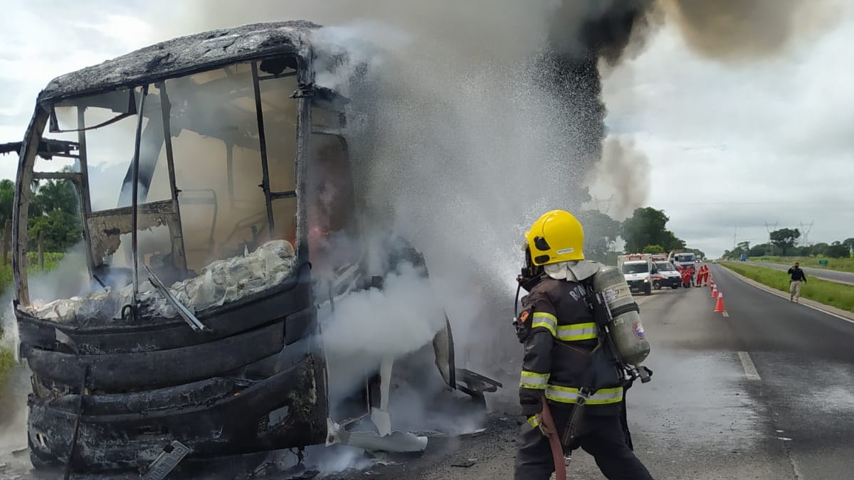 Um ônibus do transporte coletivo ficou completamente destruído após pegar fogo, na manhã desta quarta-feira (21). De acordo com o Corpo de Bombeiros, o caso aconteceu no km 599 da BR-153, sentido Morrinhos.
