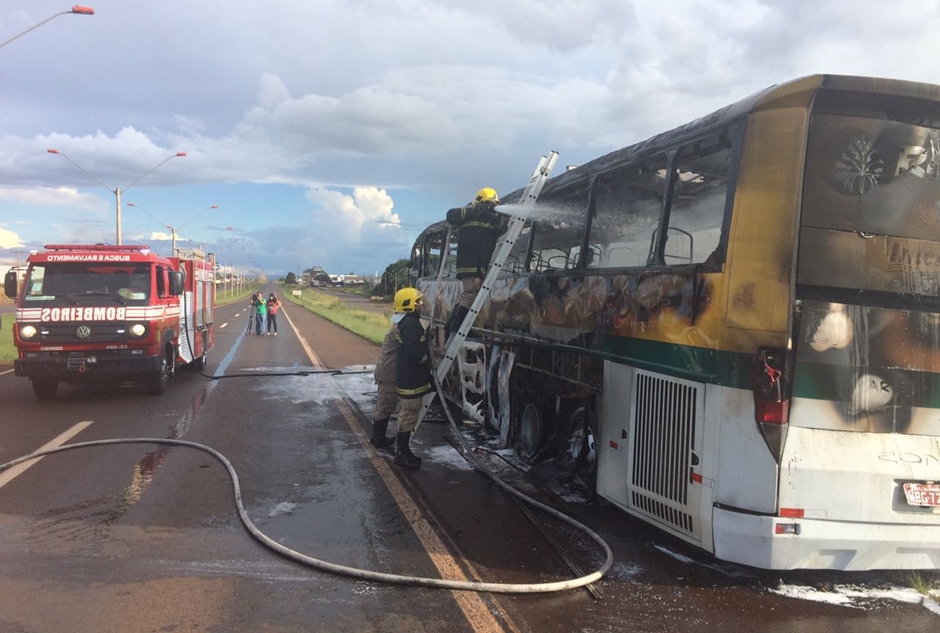 Um ônibus ficou completamente destruído após um incêndio na tarde desta segunda-feira (20). O veículo estava trafegando na BR-153, em Itumbiara, quando começou o incêndio.