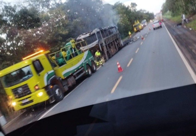 Um ônibus da empresa Transbrasiliana, que saiu de Goiânia com destino a Colinas, no Tocantins, pegou fogo na BR-153, na entrada de Figueirópolis (TO), na madrugada deste sábado (8).