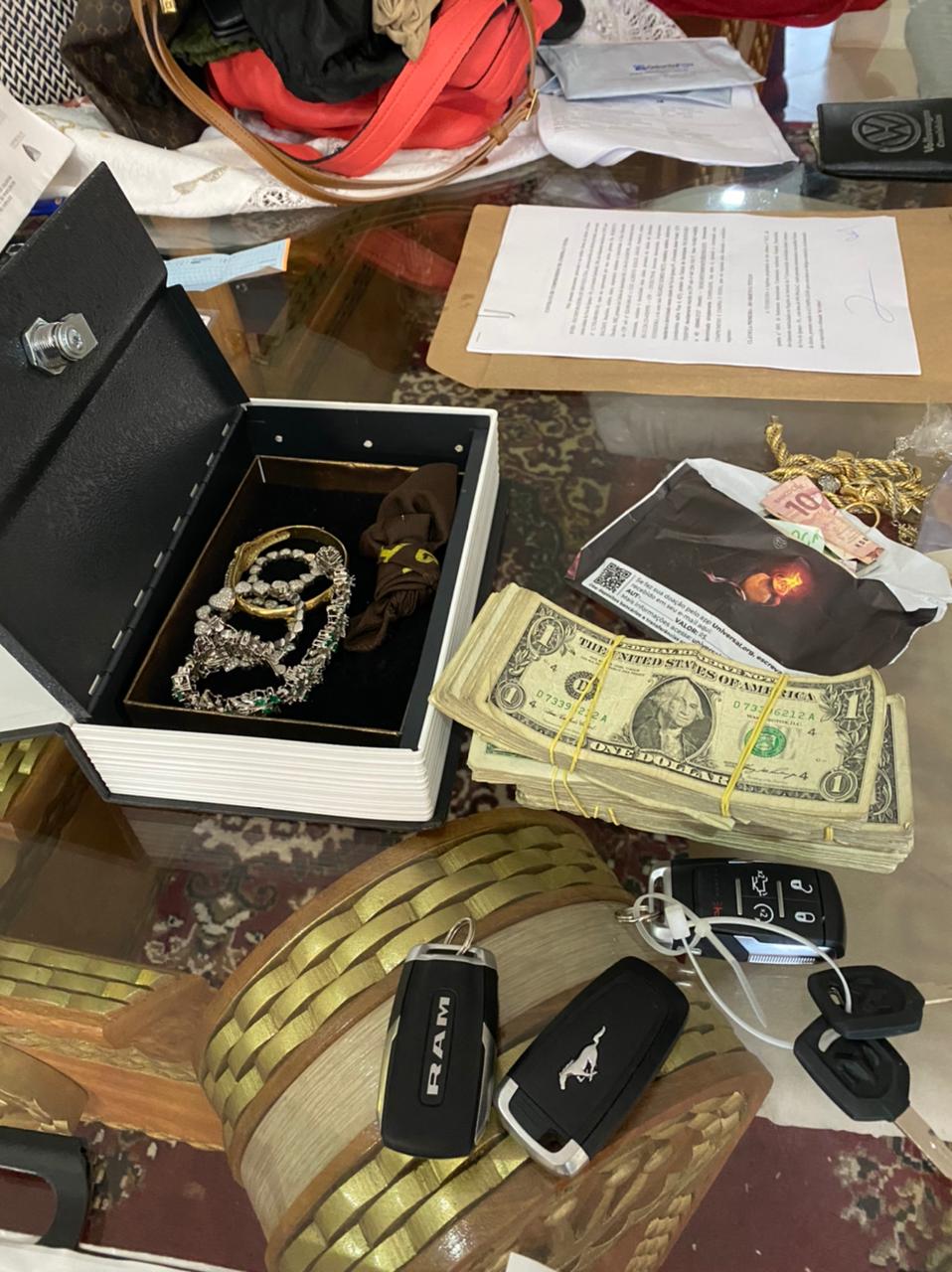 Durante o cumprimento dos mandados, foram encontrados dois carros, um Mustang e uma SW4; dólares e reais em espécie; joias em ouro; documentos falsos e cartões de crédito em nomes falsos.
