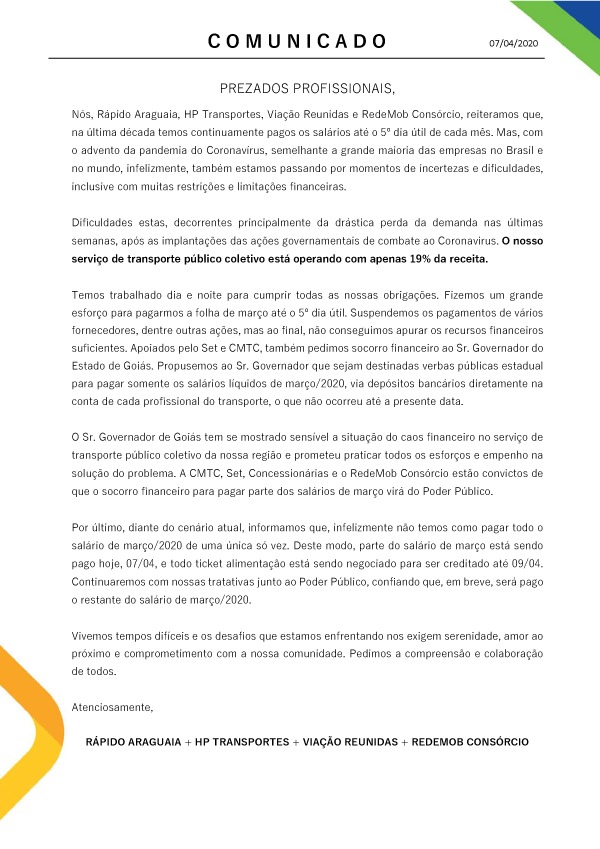 Por meio de comunicado as concessionárias do transporte público goianiense – Rápido Araguaia, HP Transportes, Viação Reunidas e RedeMob Consórcio – informaram que não teriam condição de pagar todo o salário do mês de março de 2020 de uma só vez. “Parte está sendo pago hoje, 07/04, e todo o ticket alimentação está sendo negociado para ser creditado até 09/04.” Segundo o texto, a expectativa é que, “em breve”, o restante será quitado.”