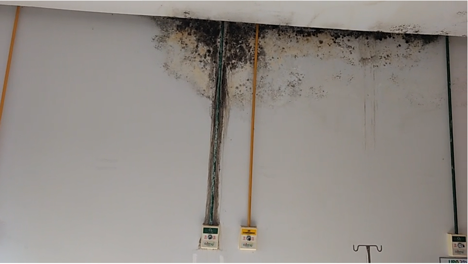 Na sala de triagem das consultas acontece o mesmo. Em um vídeo encaminhado à nossa equipe aparecem vasilhas improvisadas para conter a água que escorre do ar condicionado. Em outra sala da unidade, mais vazamento e mofo. Já numa terceira sala, o mofo atinge a estrutura de tubulação do oxigênio. “A higiene da sala já fica comprometida só devido à quantidade de mofo. Perto da vasilha fica uma bandeja cheia de equipo para soro”, diz o leitor.