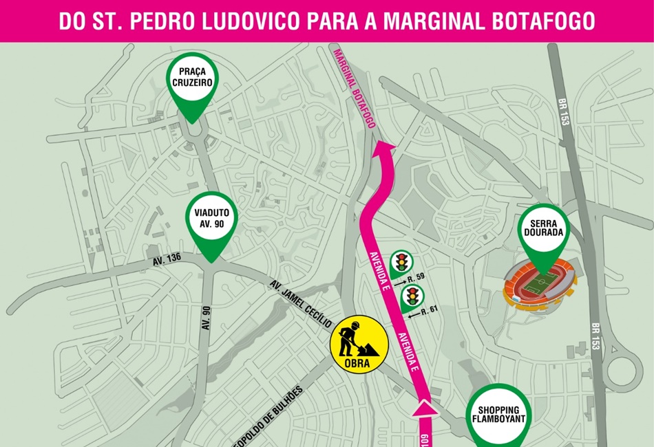 1 – Quem sai da região Sul rumo a região Norte deve pegar a Alameda Leopoldo de Bulhões, no setor Pedro Ludovico, até a Rua 1018, que foi alargada para melhorar o fluxo, seguir pela Rua 109, Avenida E e acessar a Marginal Botafogo, no Jardim Goiás.