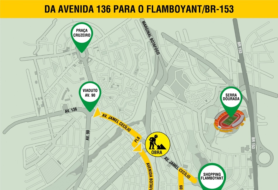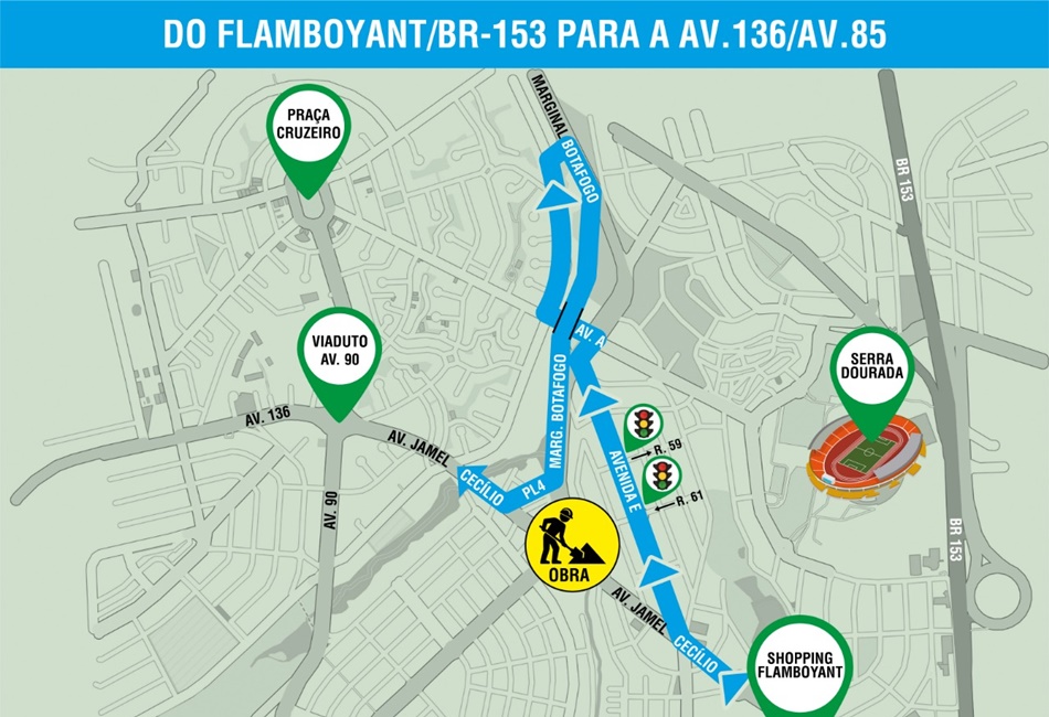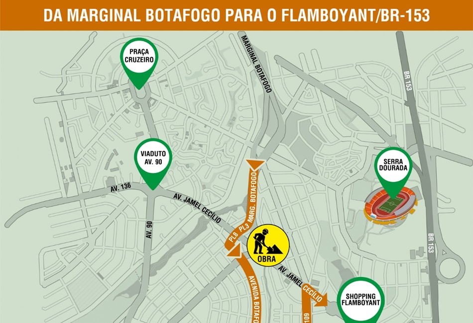 5- Quem está vindo pela Avenida Jamel Cecílio e quer acessar a BR -153, o desvio será feito pela Rua PL-8, seguindo a Avenida Botafogo, Rua 1018 e Rua 109 até retornar a Avenida Jamel Cecílio.