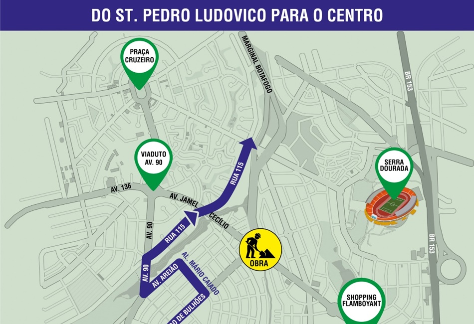 2 – Para acessar o Centro a partir do Pedro Ludovico o motorista deve pegar a Alameda Leopoldo de Bulhões até a Alameda Mário Caiado, seguir a Avenida Areião, Rua 90 e Rua 115 até a Rua 88, que dá acesso normal ao Centro.