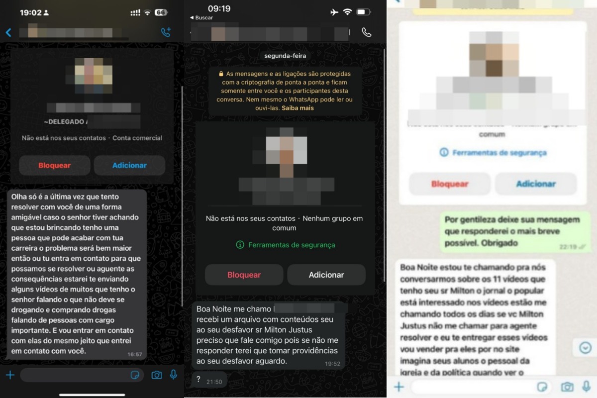 Um dos investigados, que usa nome e foto de delegado para ameaçar e cobrar dinheiro, tem atuação mais frequente. “Sobre esses vídeos, tenho mais o senhor comprando droga e falando o que não devia”, disse o suspeito em uma das mensagens. “Estou te chamando pra [sic] nós conversarmos sobre os 11 vídeos que tenho seu sr Milton”, enviou o homem a partir de outro número.