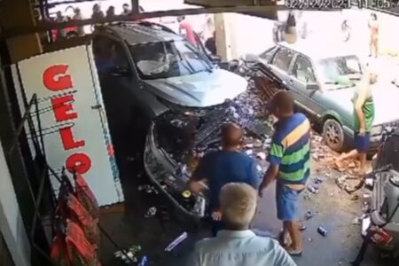SUSTO Homem é arremessado para dentro de distribuidora após acidente envolvendo dois carros em Goiânia Com a colisão, um dos veículos acabou invadindo a calçada e atingiu de forma violenta uma distribuidora de veículos há 2 anos