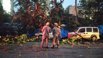 Acidente Cinco pessoas ficam feridas após árvore cair em cima de barracas na feira da Praça do Sol, em Goiânia Veículos que estavam estacionados também foram atingidos pela árvore há 2 anos