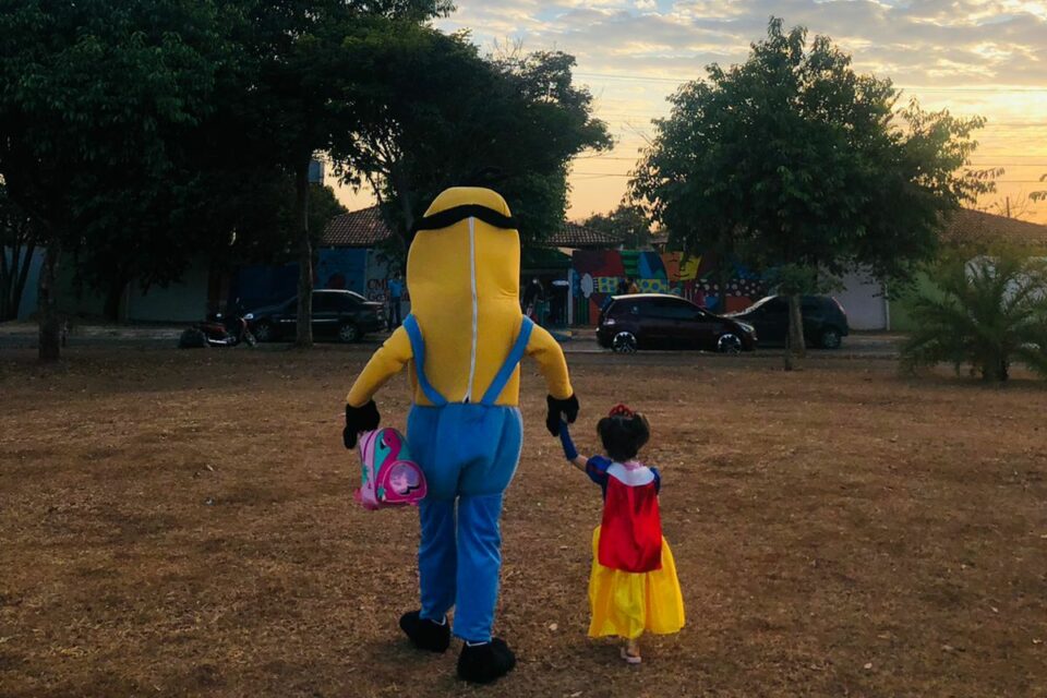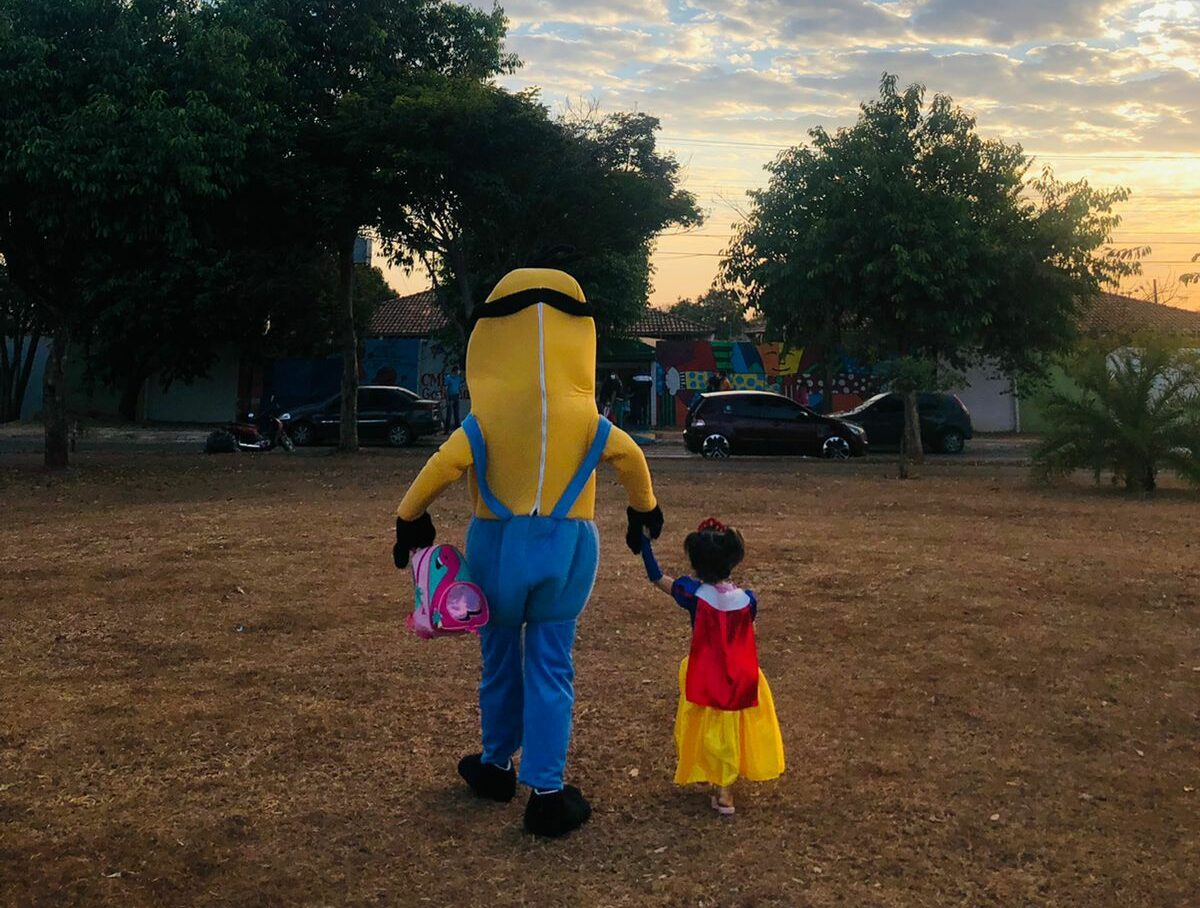 Pai se fantasia de ‘minion’ para levar filha a Cmei no 2º dia de aulas presenciais em Goiânia