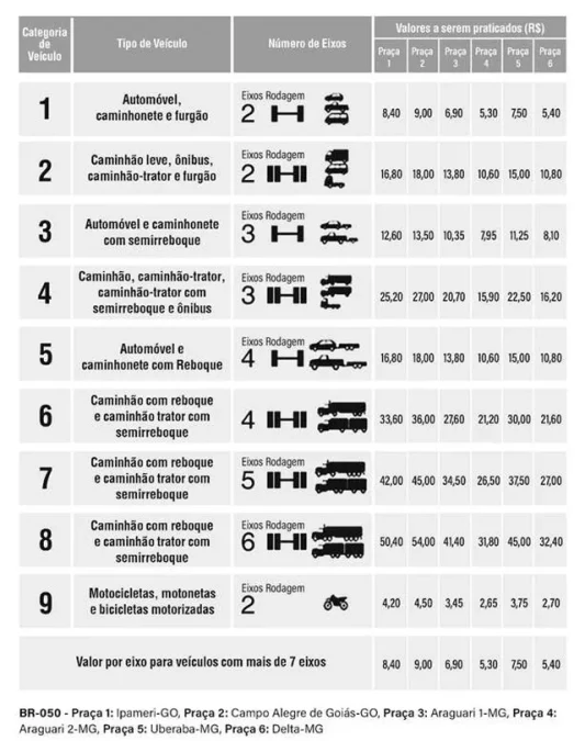 Confira abaixo o aumento de preço no pedágio da BR-050: