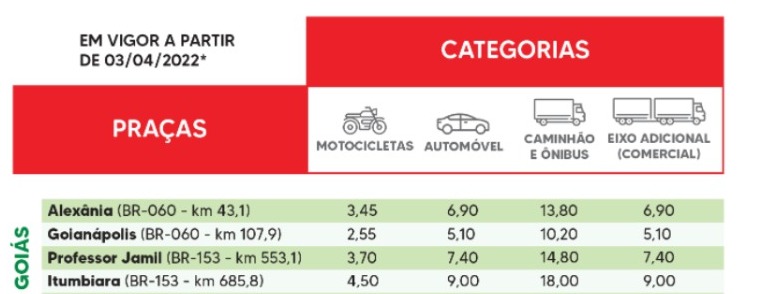 Segundo a empresa, os aumentos serão aplicados nas praças de Alexânia (BR-060), Goianápolis (BR-060), Professor Jamil (BR-153) e Itumbiara (BR-153).
