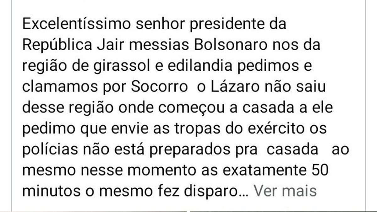 Circula nas redes sociais e nos grupos de WhatsApp uma mensagem de um morador da região de Girassol, distrito de Cocalzinho, local onde está instalada a base operacional da força-tarefa policial empenhada na captura do serial killer Lázaro Barbosa.