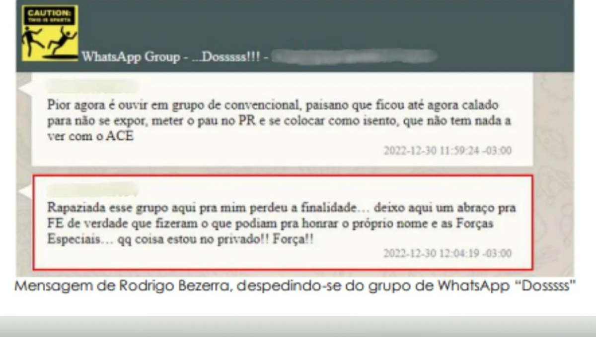 Ainda de acordo com a PF, Rodrigo fazia parte do grupo “…Dossssss!!!” e usava o codinome Zeza. O Coronel Mauro Cid era o administrador do grupo. Investigações da polícia apontam que Cid é ex-ajudante do ex-presidente Jair Bolsonaro. No dia 30 de setembro de 2022, mesma data em que Bolsonaro deixou o Brasil, Rodrigo postou a seguinte mensagem no grupo: “Rapaziada, esse grupo aqui para mim perdeu a finalidade… deixo aqui um abraço para FE de verdade, que fizeram o que podiam para honrar o próprio nome e as Forças Especiais… qualquer coisa, estou no privado!! Força!!”.