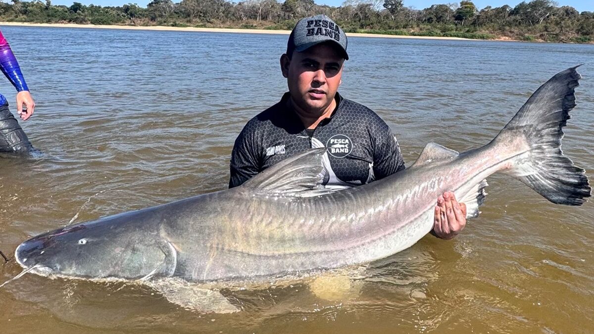 Um grupo de pescadores esportivos capturou uma piraíba gigante de 2,01 metros e mais de 100 kg no Rio Araguaia, em Nova Crixás, região norte de Goiás, no último sábado (5). Um vídeo registra a comemoração da equipe ao fisgar o peixe, que foi devolvido às águas, em seguida.