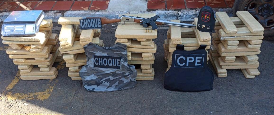 No local, a polícia encontrou mais dois suspeitos, um rifle calibre .38 com três munições intactas, além de 153 kg de maconha em um quarto – totalizando 153,3 kg. Na casa, ainda havia uma balança para pesagem e vários produtos para embalagem da droga.