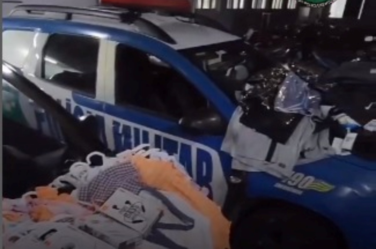 Os policiais conseguiram interceptar o veículo dos criminosos na saída do shopping, onde encontraram uma sacola cinza envolta em papel alumínio, usada para enganar os detectores. Dentro dela, havia mais de 250 peças de roupas de criança e da marca Nike, avaliadas em R$ 100 mil, que foram furtadas de outro shopping.