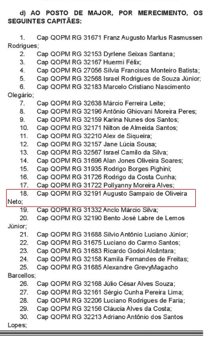 Pela lei estadual n°8.000/1975, a promoção por merecimento é aquela que se baseia no “conjunto de atributos e qualidades que distinguem e realçam o valor do Oficial PM entre seus pares, avaliados no decurso da carreira e no desempenho de cargos e comissões exercidos, em particular no posto que ocupa ao ser cogitado para promoção’. No artigo 30 da legislação, fica excluído do quadro de Acesso por Merecimento, já organizado, ou dele não poderá constar, o oficial que estiver respondendo a inquérito por crime ou denunciado pelo mesmo motivo, a critério da Comissão de Promoção de Oficiais (CPO).