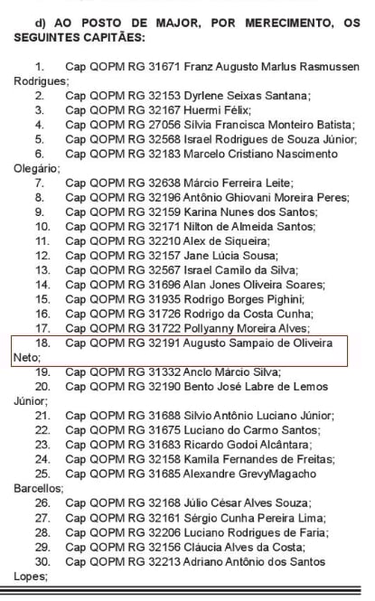 Pela lei estadual n°8.000/1975, a promoção por merecimento é aquela que se baseia no “conjunto de atributos e qualidades que distinguem e realçam o valor do Oficial PM entre seus pares, avaliados no decurso da carreira e no desempenho de cargos e comissões exercidos, em particular no posto que ocupa ao ser cogitado para promoção’. No artigo 30 da legislação, fica excluído do quadro de Acesso por Merecimento, já organizado, ou dele não poderá constar, o oficial que estiver respondendo a inquérito por crime ou denunciado pelo mesmo motivo, a critério da Comissão de Promoção de Oficiais (CPO).