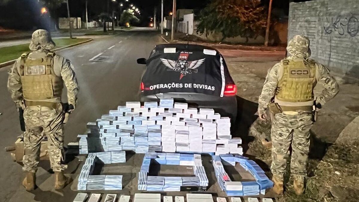 Durante o patrulhamento, a equipe do COD se deparou com um veículo em atitude suspeita. Ao realizar a busca veicular, os agentes encontraram uma carga significativa de aparelhos celulares, todos provenientes do crime de descaminho — prática que consiste na importação irregular de mercadorias sem o pagamento de impostos.