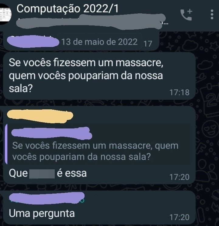 De acordo com relatos de alunos da universidade, na sexta-feira (13), o estudante causou pânico ao questionar, em um grupo do WhatsApp, quem as pessoas poupariam em caso de um massacre na instituição.