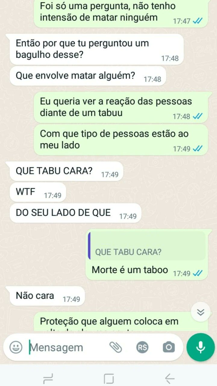 Com medo, alguns colegas de turma buscaram entender o motivo do questionamento do aluno. Em resposta, o jovem disse não ter intenção de realizar o massacre, mas queria ver a reação das pessoas diante de um tabu (a morte).