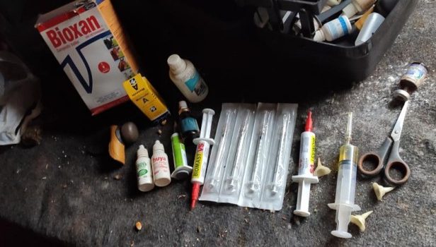 De acordo com a PM, o dono do local informou que criava os galos, mas negou usar as aves para rinhas no lugar, e que as rinhas ocorriam em outra região. No entanto, além dos vários galos presos em gaiolas e machucados – 16 em gaiolas e 17 frangos soltos – e das vitaminas injetáveis, os policiais encontraram diversos acessórios usados nas brigas, como esporas.