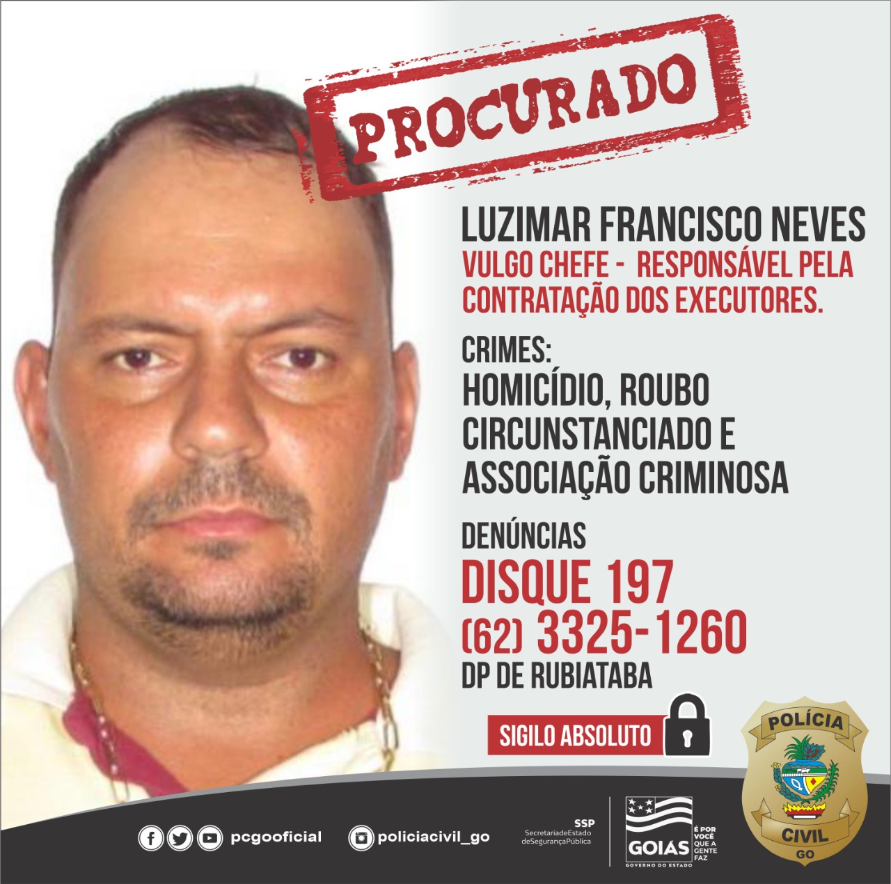 A Polícia Civil de Goiás divulgou há pouco a foto de Luzimar Francisco Neto (também conhecido como “chefe”), que está foragido e é procurado por ser o suposto responsável por contratar os homens que mataram Luiz Fernando Alves Chaves na madrugada da última quarta (29). Luiz Fernando tinha 40 anos, era dono de um cartório em Rubiataba e havia sido sequestrado na porta de casa na noite de terça.