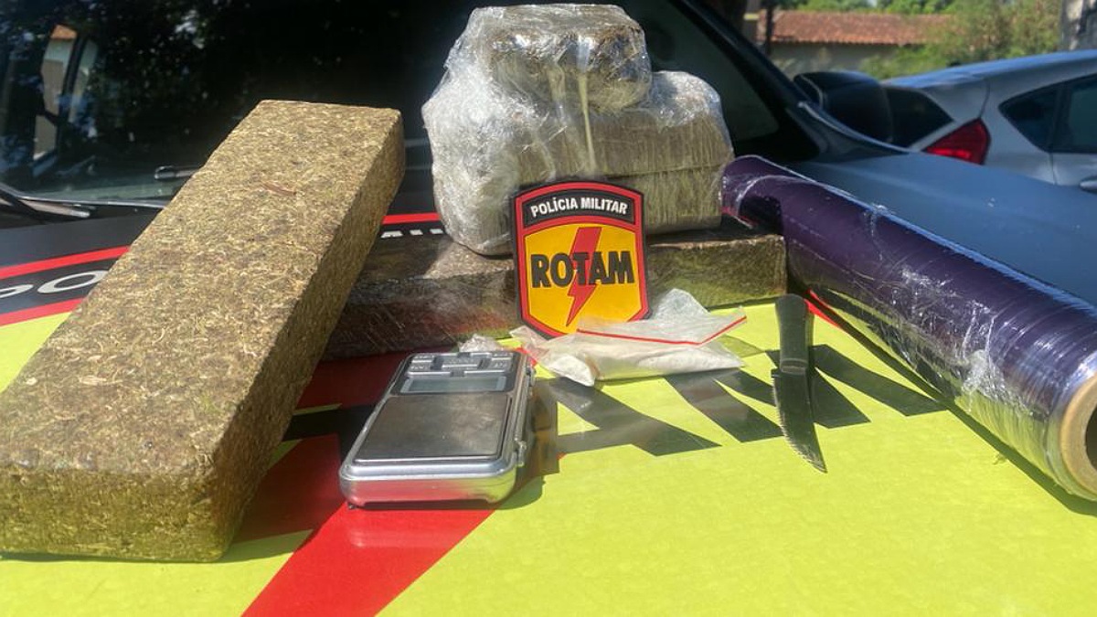 Na abordagem, foram apreendidos dois tabletes inteiros de maconha e outros três já cortados