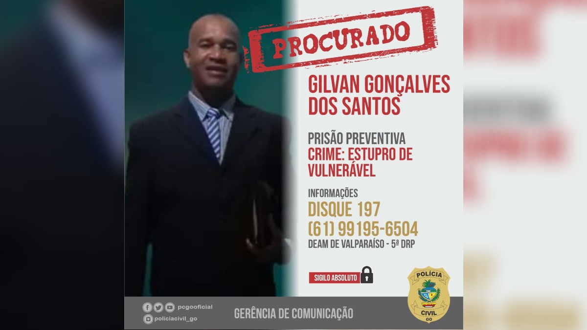 A Polícia Civil de Goiás (PCGO) procura por um pastor de 55 anos suspeito de estupro de vulnerável na modalidade virtual contra uma adolescente, que passava por “momento de depressão”, em Valparaíso de Goiás. Nesta terça-feira (15), a corporação cumpriu mandado de busca e apreensão, mas o líder religioso não foi localizado.