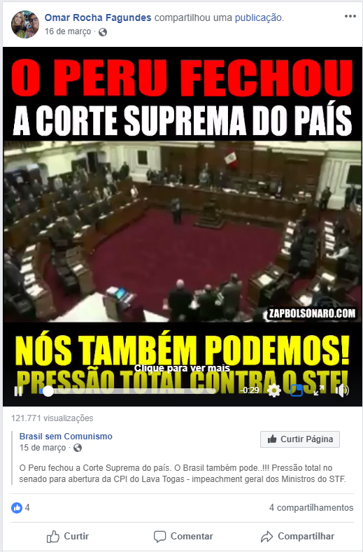 Em outra, ele compartilha uma postagem com a seguinte afirmação “O Peru fechou a corte suprema do país. Nós também podemos! Pressão total contra o STF”.