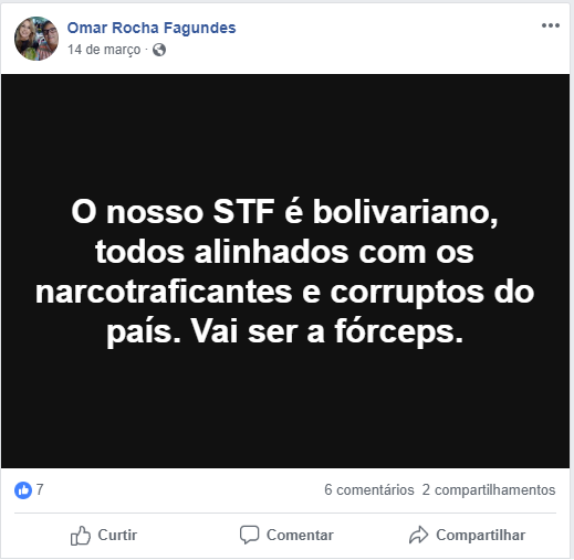 Uma das postagens de Omar que são apuradas pela justiça afirma que o STF seria “bolivariano” e que os ministros estariam alinhados com “narcotraficantes e corruptos”.