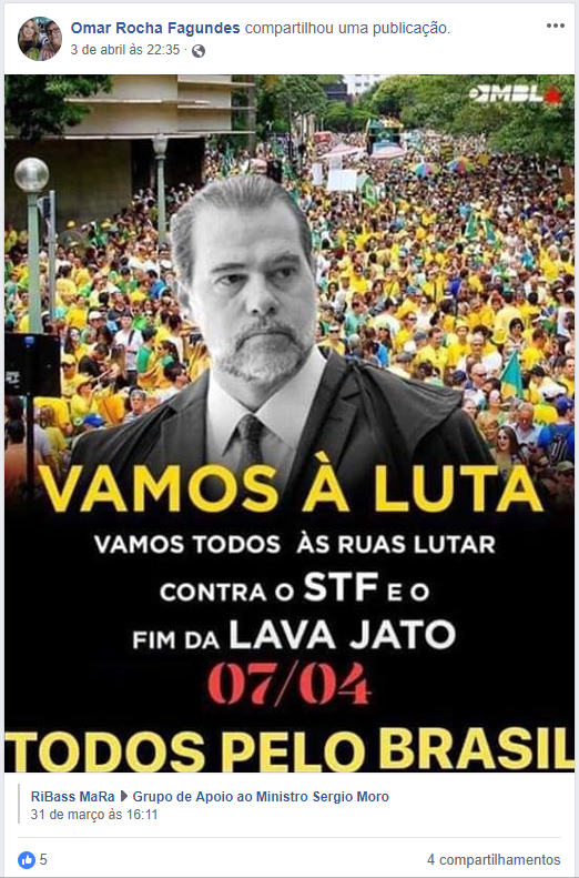 Além dessas manifestações, é possível verificar uma série de postagens contra o STF e seus ministros. Em uma delas, ele convoca a população a participar de uma manifestação contra a corte e em defesa da Operação Lava-Jato.